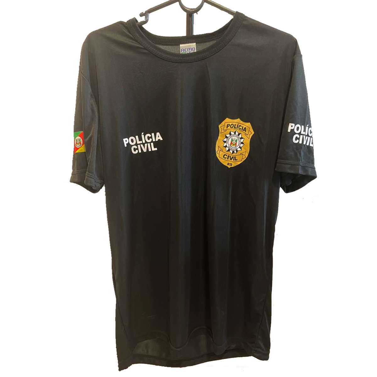 A camiseta segue o padrão visual da Polícia Civil do Rio Grande do Sul, com aplicação do logo e identidade visual cuidadosamente alinhados à instituição.